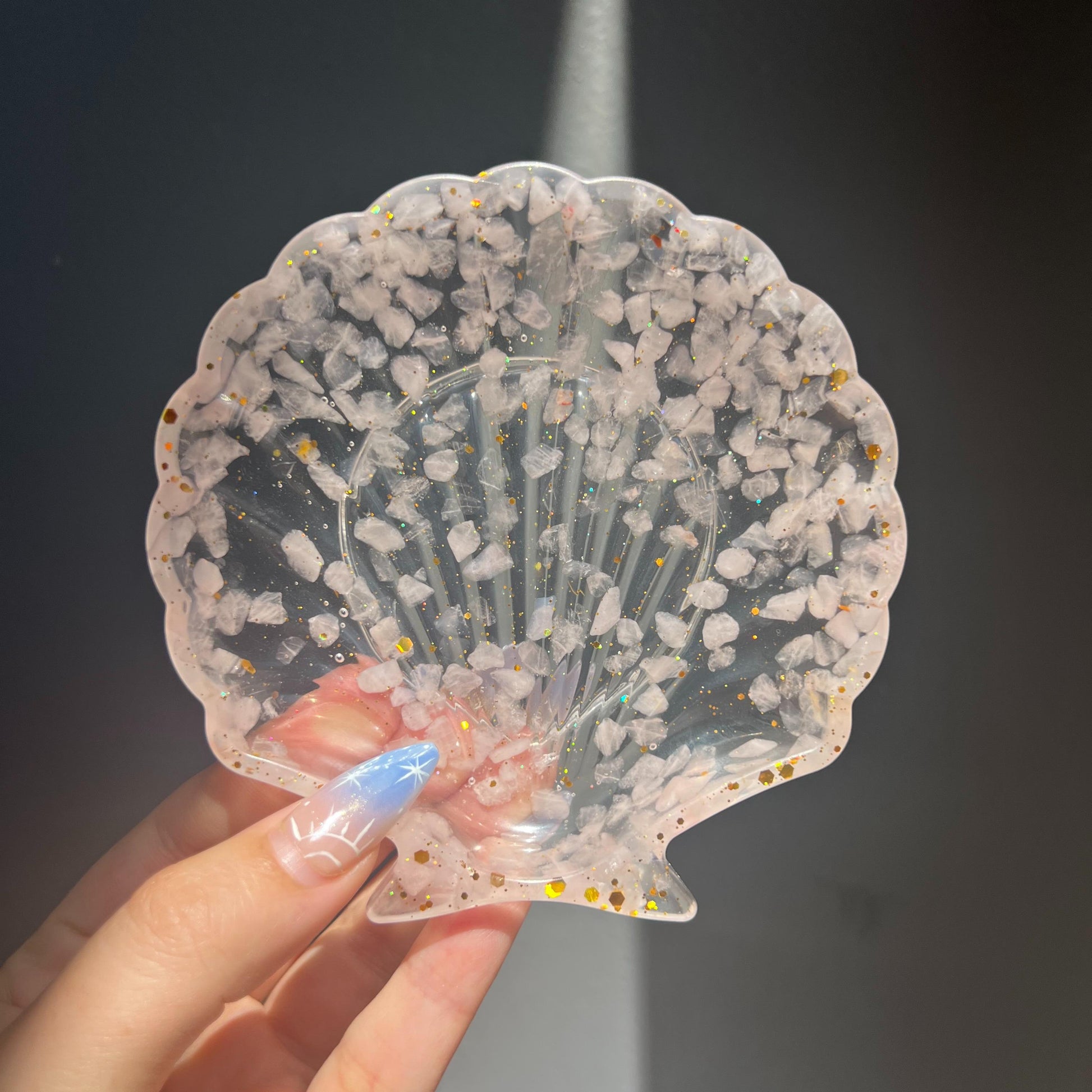 Explore the Crystal Seashell Resin Bowl – a unique blend of natural elegance and artistic design. This bowl is shaped like a seashell and cast in durable resin, featuring a selection of hand-placed crystal pieces. Compact in size at 3x4 inches, it's perfect for adding a touch of charm to any room. Choose from a variety of crystals like Rose Quartz, Black Obsidian, and more to personalize your bowl. Ideal for storing small items or as a standalone decorative piece, this bowl is a wonderful way to incorporate the beauty of nature into your home.