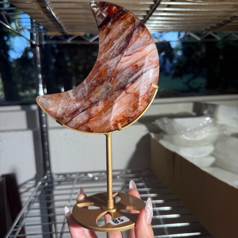 Carved crescent moons channel energizing Fire Quartz focus. Each 4-8 in. piece sits on a sturdy, tarnish-resistant gold stand. Perfect for altar, desk, or shelf décor.